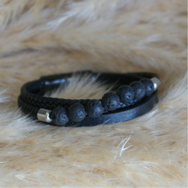 Ce bracelet en cuir met en valeur la pierre de lave, issue des profondeurs de la terre.